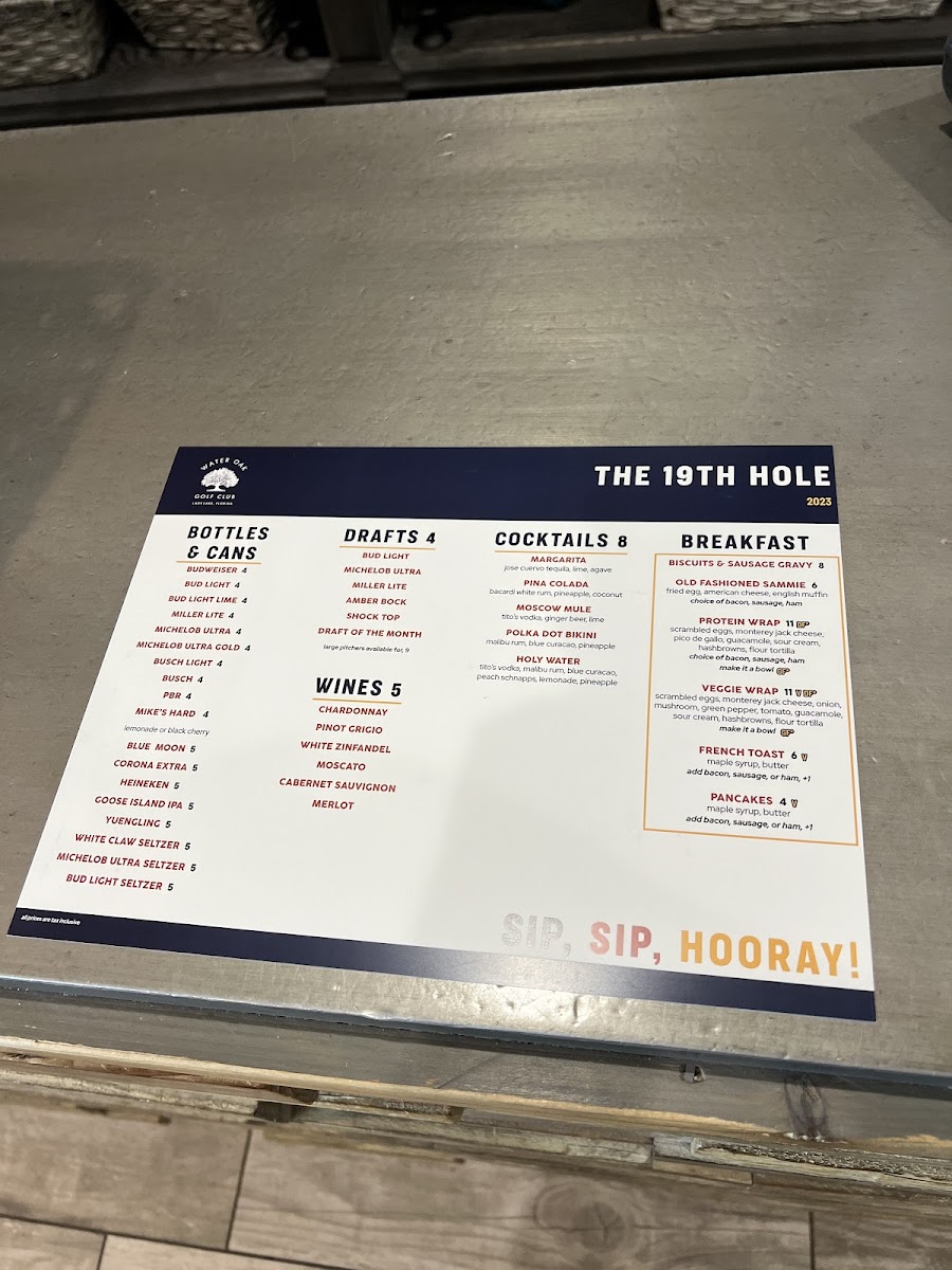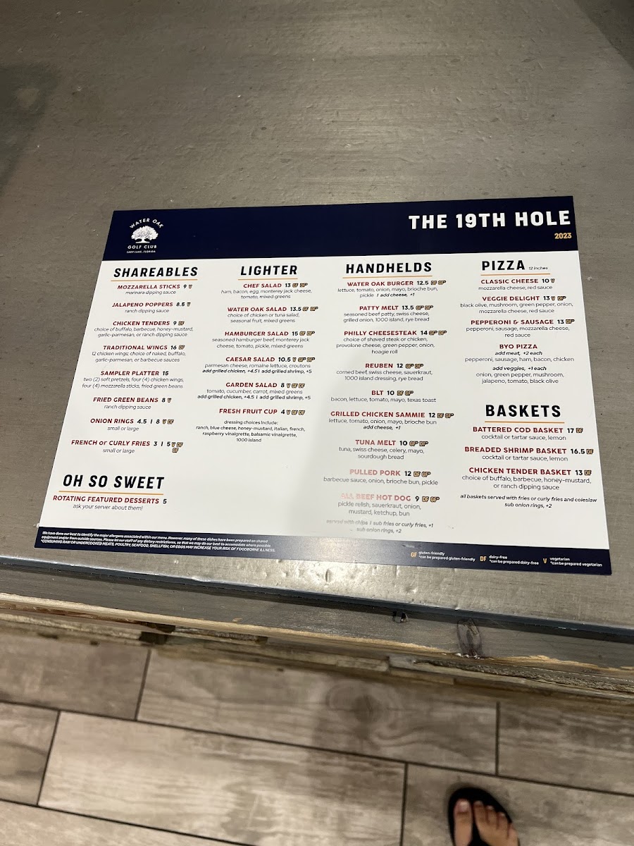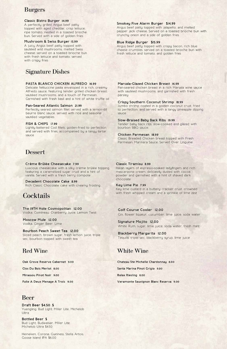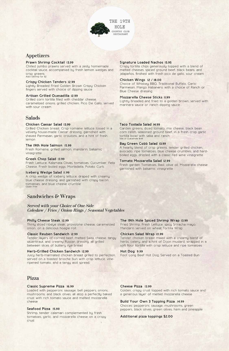 The Bistro At The 19th Hole offers a diverse and inviting menu that caters to a variety of tastes. For salad lovers, options like the Bay Green Cobb Salad, Greek Chop Salad, and Iceberg Wedge Salad provide fresh and flavorful choices, with the Taco Tostada Salad offering a unique twist. Appetizers such as the Artisan Grilled Quesadilla and Signature Loaded Nachos are perfect for sharing, while the Prawn Shrimp Cocktail and Mozzarella Sticks are great starters. For heartier options, the Chicken Parmesan and Slow Braised Baby Back Ribs are standouts, along with the crispy Fish & Chips. The Pasta Blanco Chicken Alfredo and Crispy Southern Coconut Shrimp also bring a delightful taste of comfort. For those in the mood for a burger, the Blue Ridge Burger and Mushroom & Swiss Burger offer rich, satisfying flavors, while the Smokey Five Alarm Burger brings a spicy kick. Pizzas like the Seafood Pizza and Classic Supreme Pizza provide a range of toppings, or you can create your own with the Build Your Own 3 Topping Pizza. Sandwiches and wraps like the Classic Reuben Sandwich and Herb-Grilled Chicken Sandwich complete the menu, making it clear that there's something for everyone at this charming spot.